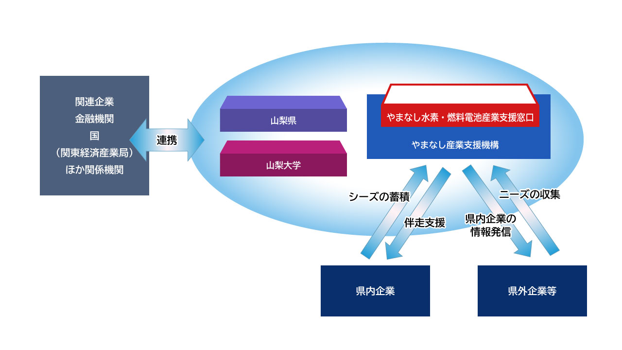 水素・燃料電池関連産業の集積地「やまなし水素・燃料電池バレー」の実現に向けて、県内企業の水素・燃料電池関連産業への本格参入を後押しする総合窓口として、やまなし産業支援機構内に「やまなし水素・燃料電池産業支援窓口」を開設しました。