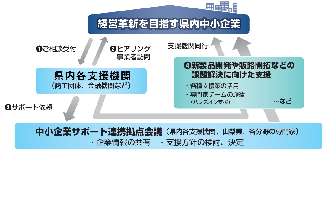 商工団体や金融機関など県内13の支援機関と山梨県が協働・連携し、新分野進出や新たな事業展開といった経営革新を行うにあたり中小企業の皆さまが直面する様々な課題の解決をサポートいたします。